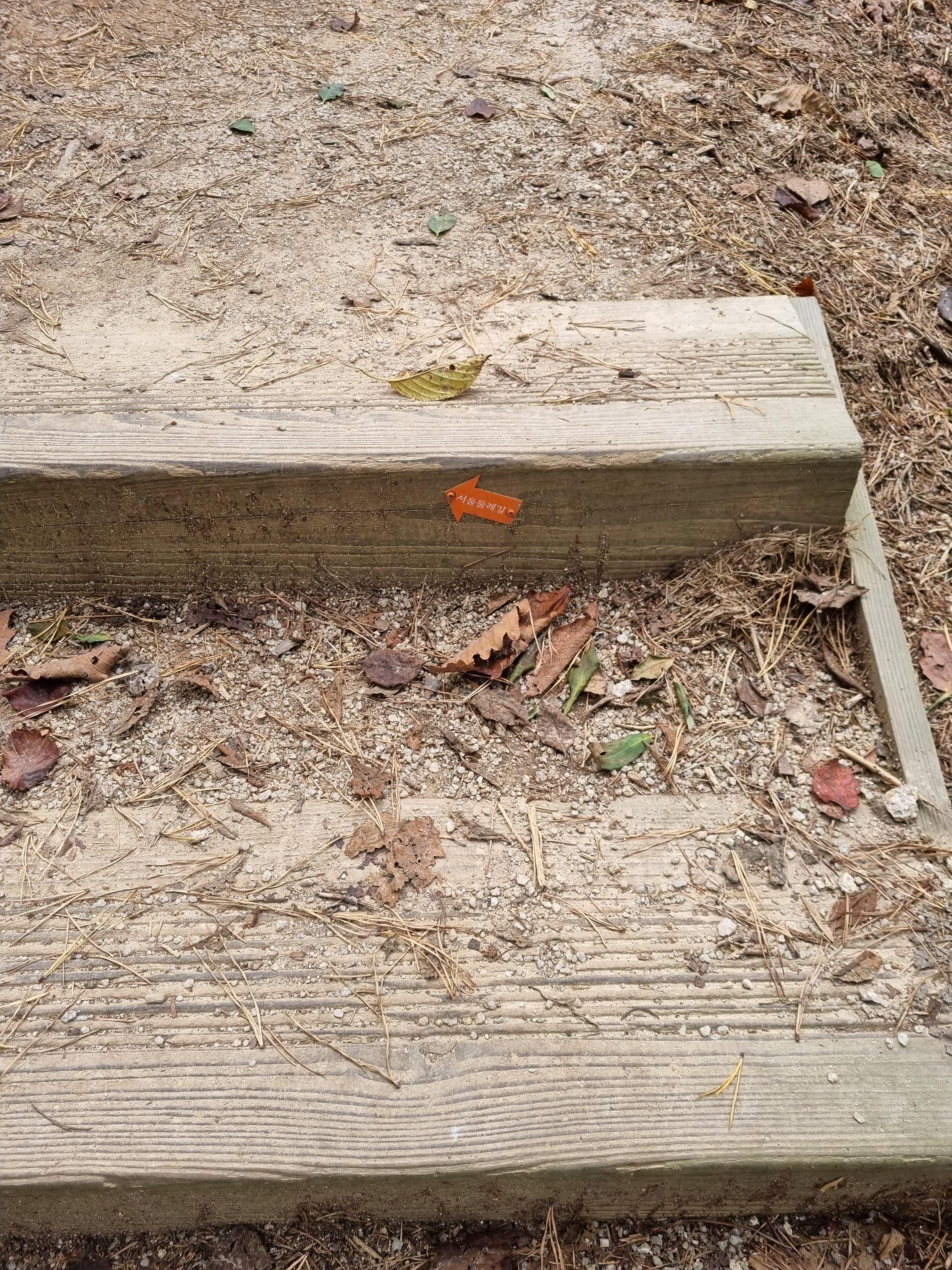 나무계단에 붙어 있는 화살표. 정말로 화살표가 가리키는 방향으로 이동 했다.