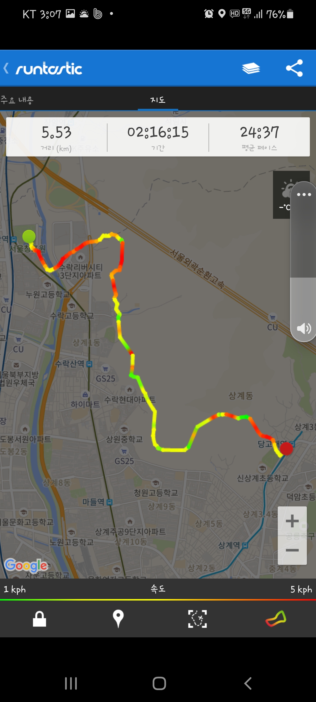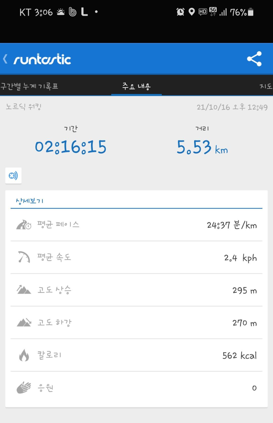2시간 16분 15초 , 5.53km 걸었다고 표시하네. 상하 길이는 빼고 직선 거리인가 ?