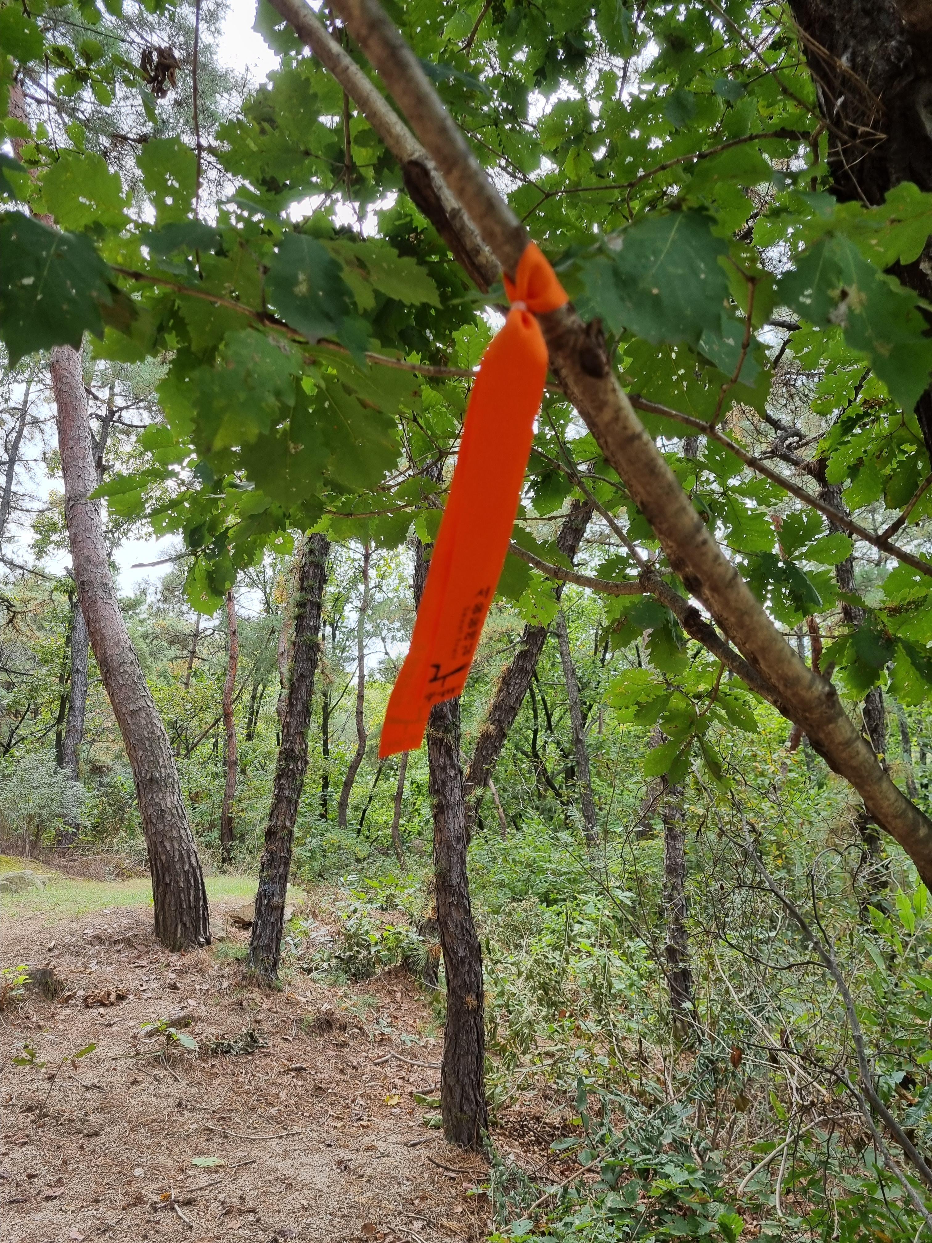 2.1km 걸었다 갈림길에는 주황색 천이 함께한다.